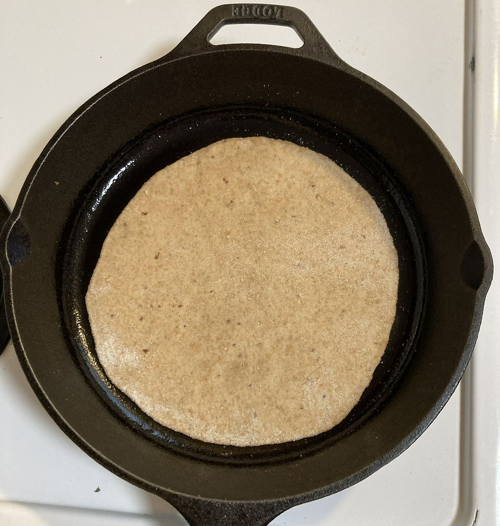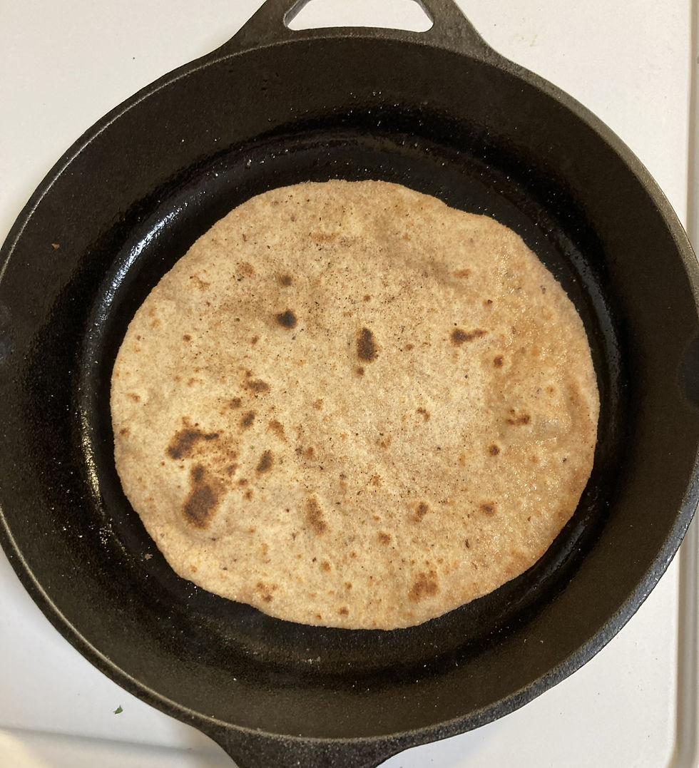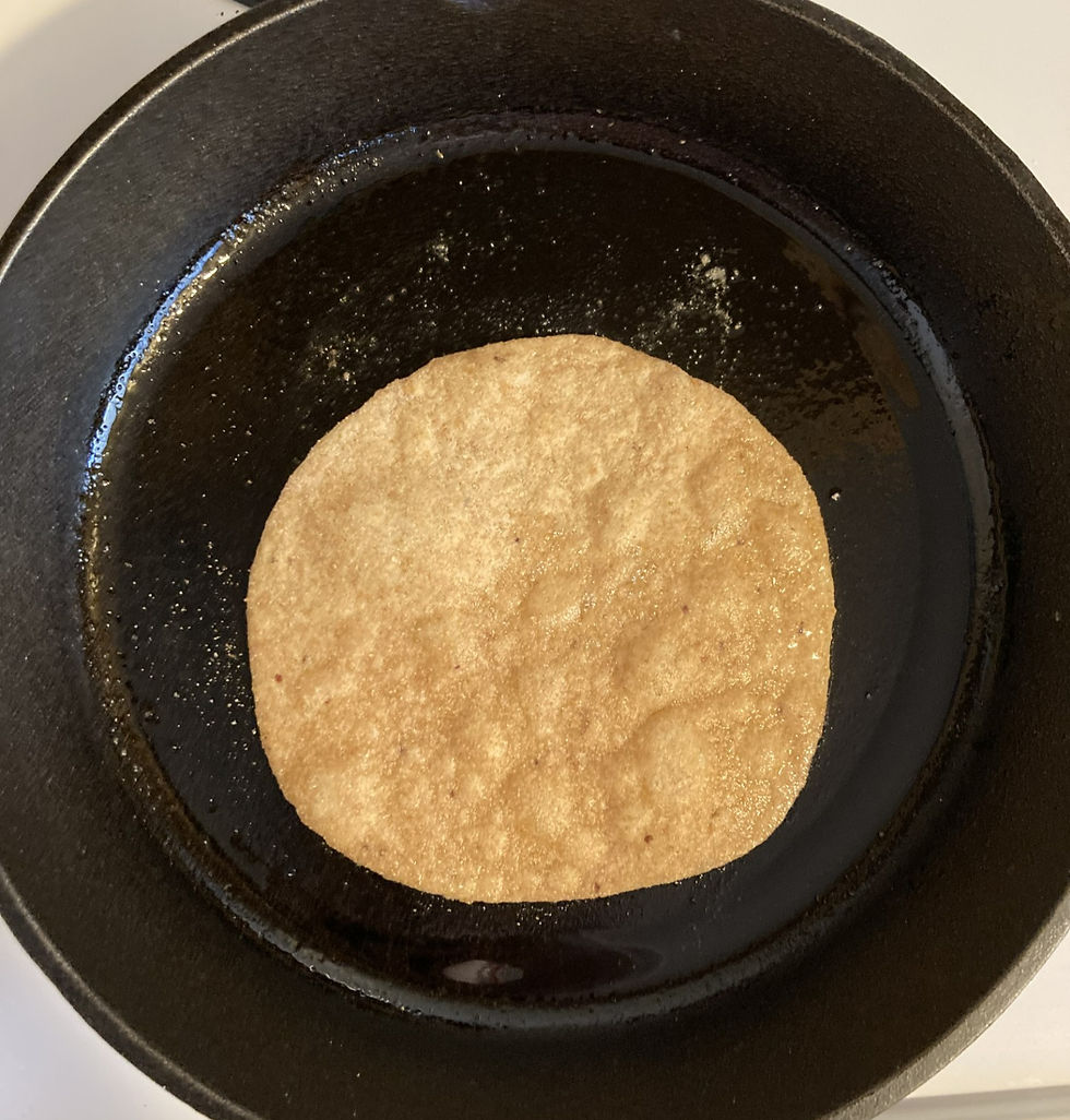 Once you place the tortilla in the pan, I like to twirl it with my fingers to make sure it is not sticking. You can also use a spatula to gently scrape on the tortilla. This can sometimes make the tortilla puff up.