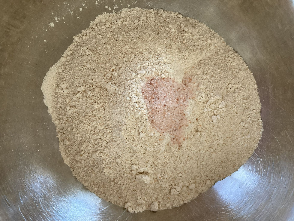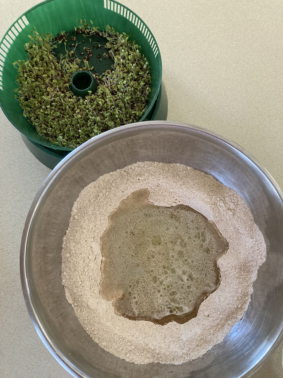 3) Make a well in the flour salt mixture. Warm the water and put the oil, water, and blended sprouts in the center of the dry mixture.