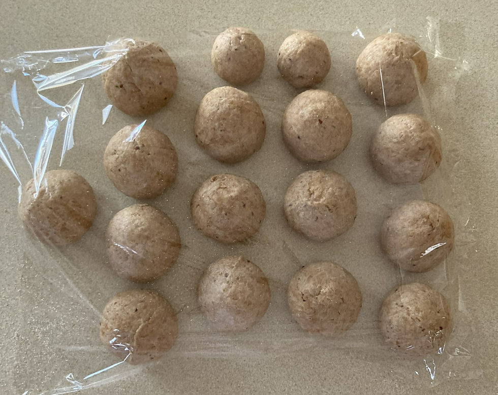 Once I had divided them (about 60g each besides the top middle two), they were a little dry. To combat this, I dipped them in water and rolled them in a little flour. This allowed me to shape them into balls. You can use a dry part of counter to round them or both hands.